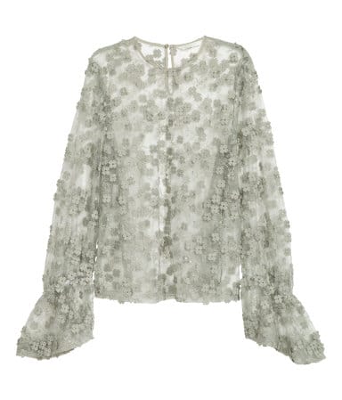 Drafting off yesterday’s post on trying something new, I’ve got a handful of unexpected treats for you to consider. First: this sheer, floral-appliqued $49 steal of a blouse from H+M. Maybe paired with those J. Crew silk shantung pants ($198) and the Aquazzura pom kitten heels ($650).